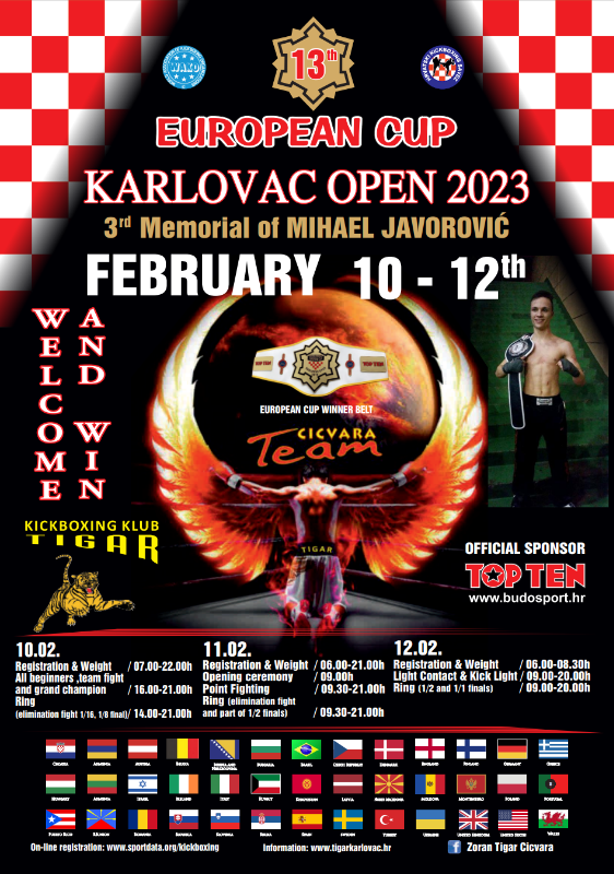 Der Kroatische Kickbox Verband lädt uns zur 13. European Cup "Karlovac Open" ein, welche vom 10 bis 12 Februar 2023 stattfindet. Der European Cup "Karlovac Open" ist einer der größten WAKO Wettbewerbe mit mehr als 2.000 Teilnehmerinnen und Teilnehmer aus 40 verschiedenen Ländern.