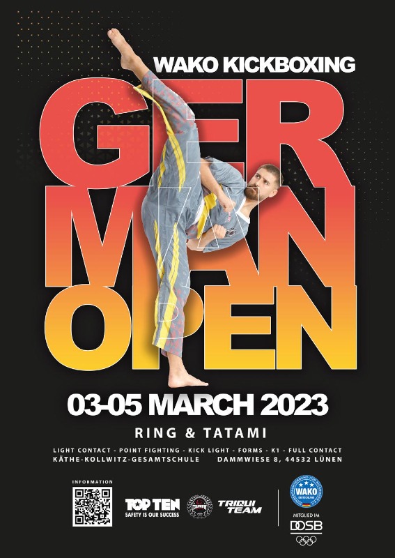 Die diesjährige Veranstaltung German Open 2023 findet kommendes Wochenende statt. Es werden Kämpfe im Pointfighting (PF), Leichtkontakt (LC), Kick Light (KL), Musik Formen (MF) / Creative Formen (CF), Vollkontakt (FC) sowie K1 stattfinden.